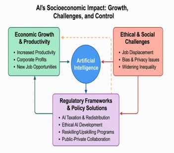 Artificial Intelligence (AI) has emerged as a transformative force driving economic expansion and innovation across industries. As organizations race to adopt AI for productivity gains, cost efficiency, and market dominance, the resulting growth has become increasingly profit-driven. However, this unregulated pursuit of technological advancement brings with it significant societal, ethical, and policy-related challenges. This research paper explores the dual nature of AI's socioeconomic impact—one marked by economic acceleration and the other by widening inequality, job displacement, and a struggle for control between corporate powerhouses and governing institutions. The core problem addressed is the lack of comprehensive governance mechanisms to balance economic incentives with the ethical and equitable deployment of AI. While AI promises significant benefits such as automation, predictive analytics, and enhanced decision-making, it also risks marginalizing underrepresented communities and concentrating power among a few technology monopolies. Our research proposes a balanced methodology: combining a literature review, comparative analysis of existing regulatory efforts, and the development of a conceptual framework integrating socio-technical ethics with economic policy. Through an architectural diagram, system design flowchart, and policy-oriented algorithm, the study outlines actionable recommendations. These include progressive AI taxation, reskilling initiatives, equitable data governance, and collaborative public-private AI governance models. By benchmarking across multiple metrics such as economic inclusivity, transparency, and scalability, the paper presents a comparative analysis of current approaches and highlights their limitations. Ultimately, the research concludes that while AI can significantly enhance socioeconomic systems, sustainable progress will only be achieved through ethical oversight and inclusive regulatory frameworks. Governments, academia, and the private sector must collaborate to redirect AI’s trajectory from unchecked profit-driven growth toward a balanced, inclusive, and equitable digital future.
