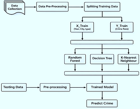 The increasing trajectory of global crime rates, exacerbated by rapid urbanization, socioeconomic disparities, and the growing sophistication of criminal methodologies, presents a formidable challenge to contemporary law enforcement. Traditional policing paradigms, predominantly reactive in nature and reliant on retrospective investigation, are proving increasingly insufficient for addressing the complex, nonlinear dynamics of modern criminal activity. This research delineates the design, development, and validation of a “crime rate prediction system,” a computational framework that leverages advanced machine learning (ML) and data mining techniques to shift law enforcement from a reactive to a preventive posture. Rooted in the specific context of Indian metropolitan cities and utilizing data standards compatible with the National Crime Records Bureau (NCRB), this system employs a supervised learning approach to analyze historical crime data. By systematically evaluating multiple algorithms, including random forest, support vector machines (SVMs), K-nearest neighbors (KNNs), and decision trees, the optimal modeling strategies for forecasting high-risk crime zones can be identified. The Random Forest Regressor achieved the best performance, with an R² score of 0.932, MAE of 2.49, and MSE of 21.43, significantly outperforming other models. The system specifically targets the identification of “hotspots” and the prediction of future crime trends, thereby enabling the strategic optimization of limited police resources. This report provides an exhaustive examination of the system’s architectural design, theoretical underpinnings, implementation methodologies using the Prototyping Model, and the ethical and technical implications of deploying artificial intelligence in public safety. Furthermore, it explores the expansive future scope of such systems, including the integration of real-time IoT data, deep learning for video analytics, and the mitigation of algorithmic bias.